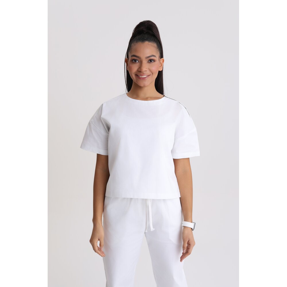 Nowoczesna bluza medyczna o luźnym kroju oversize, zaprojektowana z myślą o maksymalnym komforcie i swobodzie ruchów podczas pracy. Fason nie opina sylwetki, dzięki czemu świetnie sprawdzi się nawet podczas długich dyżurów. Model posiada klasyczny, płytki okrągły dekolt, krótkie rękawy oraz zaokrąglony wydłużony dół, który nadaje całości nowoczesny wygląd. Bluzka została wyposażona w praktyczne napy przy dekolcie, które ułatwiają zakładanie oraz zdejmowanie, a dodatkowo chronią materiał przed zabrudzeniem makijażem, np. podkładem. Starannie zaprojektowana linia ramion i pleców sprawia, że bluzka dobrze układa się na różnych typach sylwetek. Bluza uszyta jest z wysokiej jakości, oddychającej tkaniny: 98% bawełna, 2% elastan – materiał jest miękki, przyjemny w dotyku i lekko elastyczny, dzięki czemu doskonale dopasowuje się do ciała