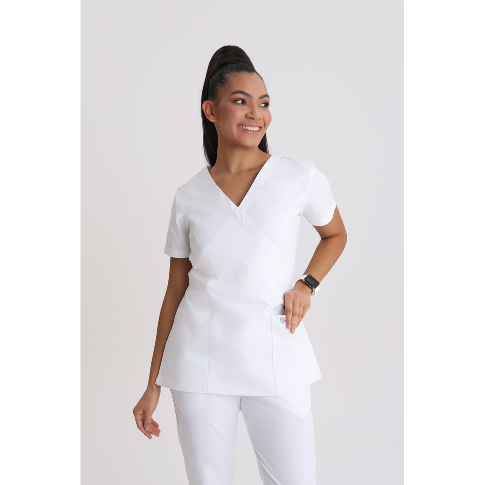 Tunika medyczna damska slim fit – nowoczesna linia i precyzyjne dopasowanie Wyjątkowa tunika medyczna o kroju slim fit, zaprojektowana z myślą o kobietach, które cenią sobie elegancję, wygodę i profesjonalny wygląd w pracy. Fason dopasowany do sylwetki, z modelującymi cięciami z tyłu i wyraźnie zaznaczoną talią, podkreśla kobiecą figurę, jednocześnie nie ograniczając swobody ruchów. Dekolt typu V optycznie wysmukla szyję, a krzyżowe przeszycia z przodu nadają tunice nowoczesnego charakteru. Tunika posiada dwie pojemne kieszenie z przodu na wysokości bioder – idealne na niezbędne akcesoria. Krótkie rękawy zapewniają komfort podczas codziennej pracy, a detale wykończenia zostały starannie dopracowane, by zapewnić trwałość i estetykę na długo. Uszyta z wysokiej jakości, oddychającej tkaniny: 98% bawełna, 2% elastan – materiał jest miękki, przyjemny w dotyku i lekko elastyczny, dzięki czemu doskonale dopasowuje się do ciała.